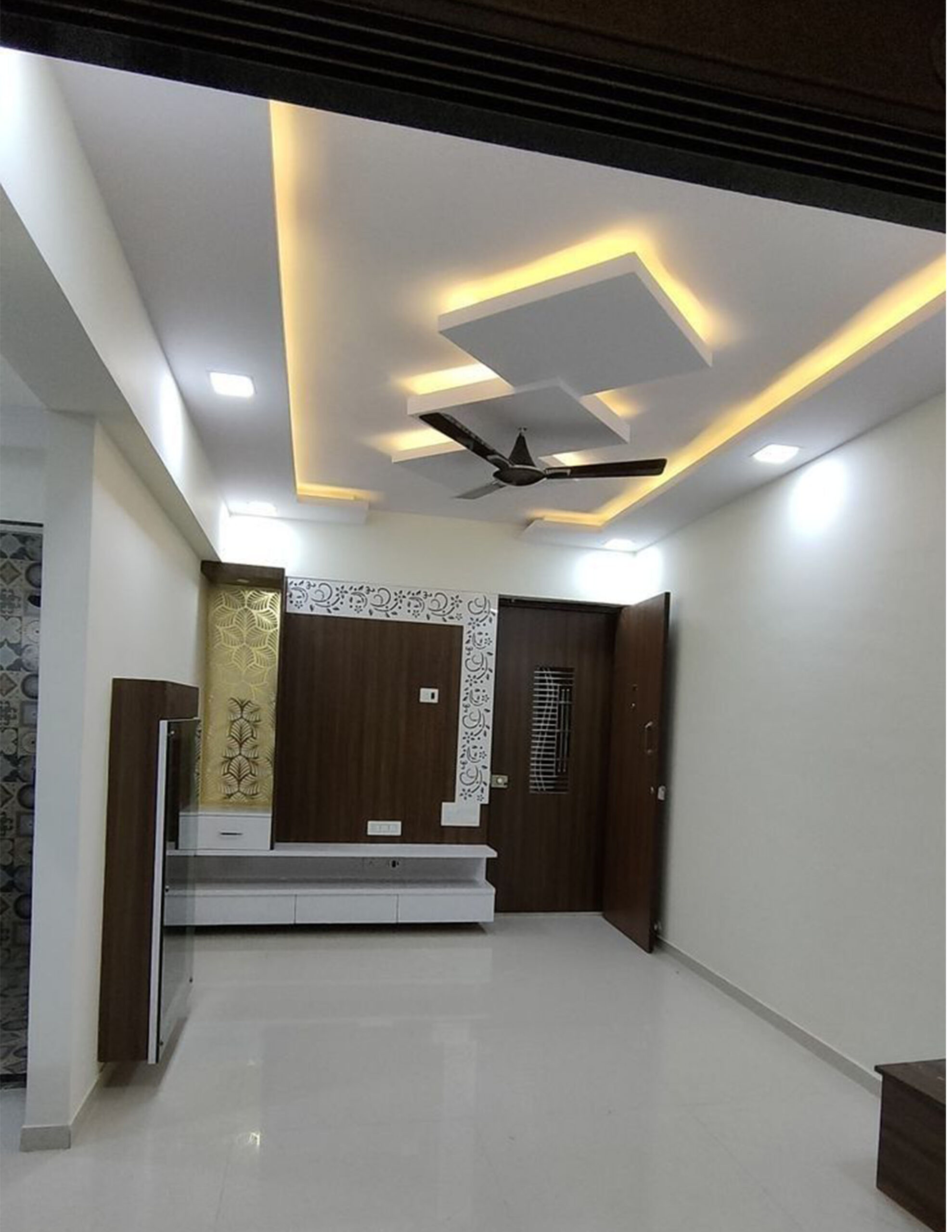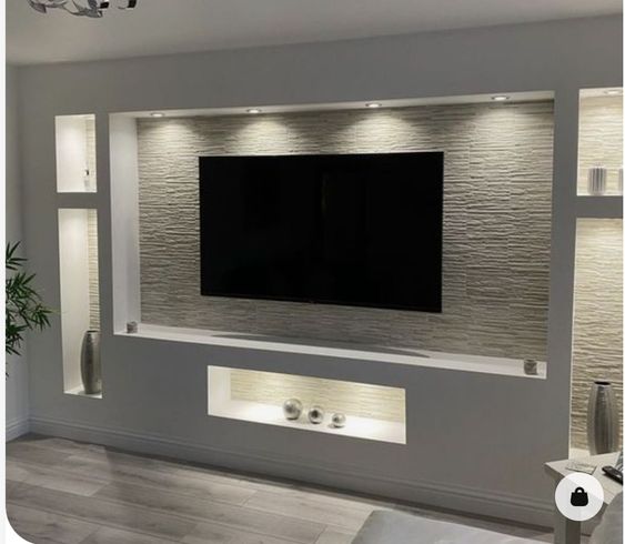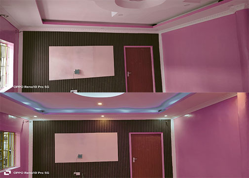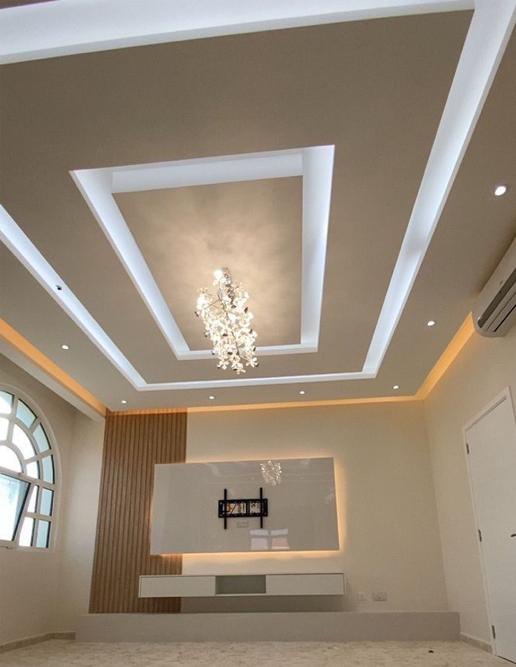 Our Living room gypsum designs enhances aesthetic appeal with stylish ceiling and wall elements. It offers versatility with crafts moldings, such as coffered or curved shapes with LED lighting. This design adds elegance, and a modern touch to the living space.